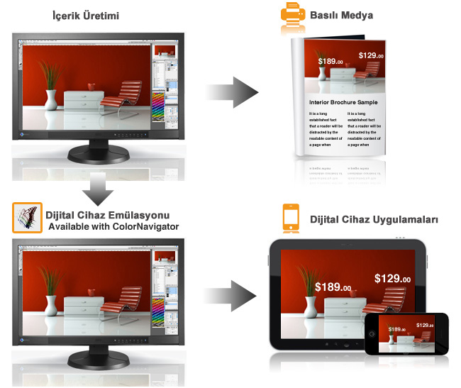 EIZO'nun ColorNavigator yazılımıyla (ayrıca satılıyor), fotoğraf, baskı ve web kullanımı gibi farklı amaçlar için profil yaratabilir ve istediğiniz zaman aralarında geçiş yapabilirsiniz.